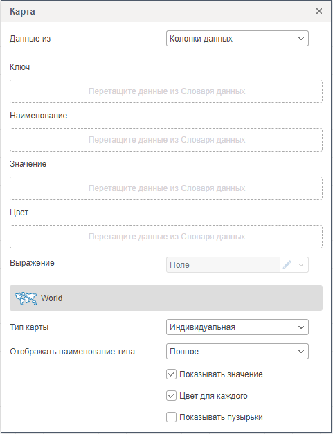 Поле Цвет - необходимо перетянуть из Словаря данные, которые содержит значение цвета в формате #FFFFF для каждого ключа карты. В случае, указания колонки данных с цветами географических объектов, необходимо также включить параметр Цвет для каждого.