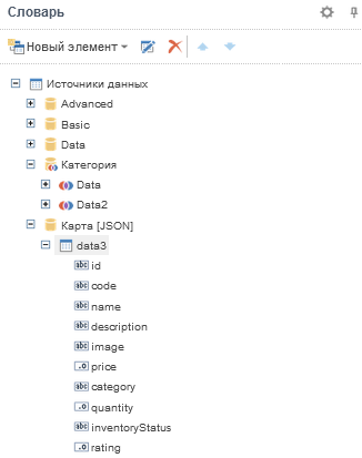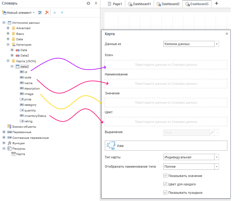 Рассмотрим настройку редактора региональной карты, если данные будут получены из полей данных. Для этого в параметре Данные из необходимо выбрать значение Колонки данных.
