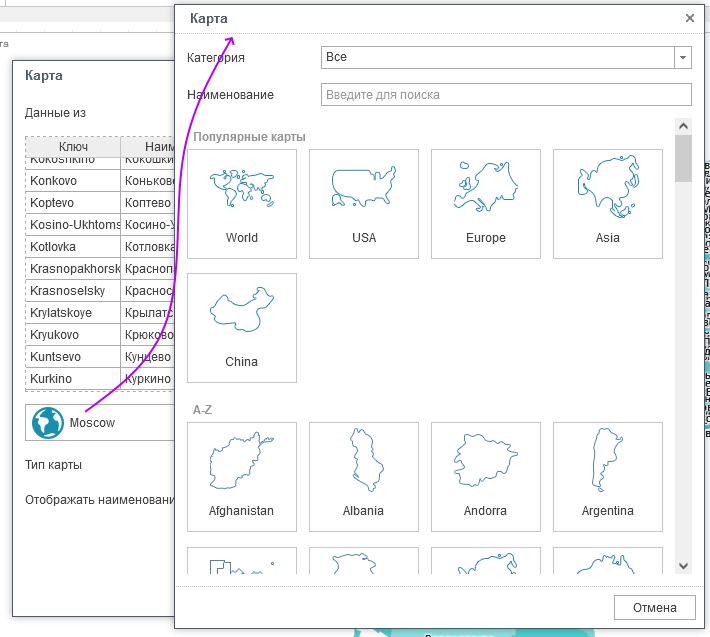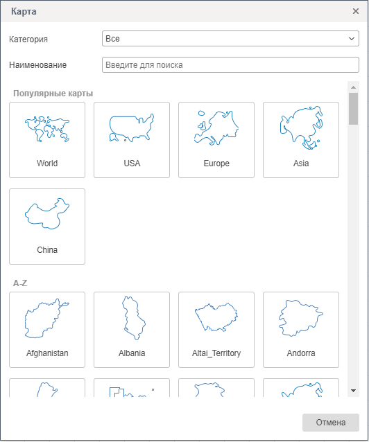 При добавлении Региональной карты на панель индикаторов открывается окно Карта в котором можно изменить вид региональной карты. Все карты сгруппированы по региональным категория. В зависимости от выбранной категории, в списке будут отображаться карты определенного вида. В поле Наименование можно указать имя карты для поиска карты определенного вида.