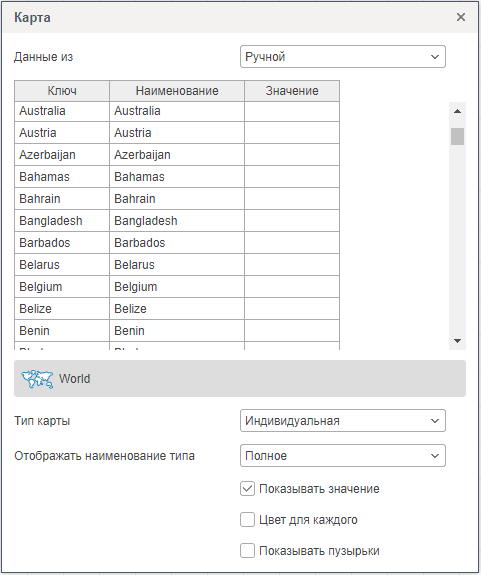 Выше представлен редактор элемента Региональная карта, при заполнении данных вручную.