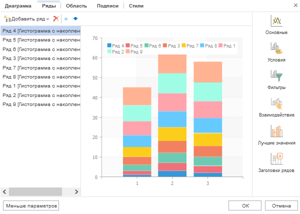 Сам список дополнительных параметров зависит от выбранного типа диаграммы. Некоторые могут быть доступны только для линейных диаграмм, другие только для столбчатых, третьи, такие как привязка к правой оси Y, зависят от значений свойств элемента. Для того чтобы скрыть панель дополнительных параметров, необходимо нажать на кнопку [Меньше параметров].