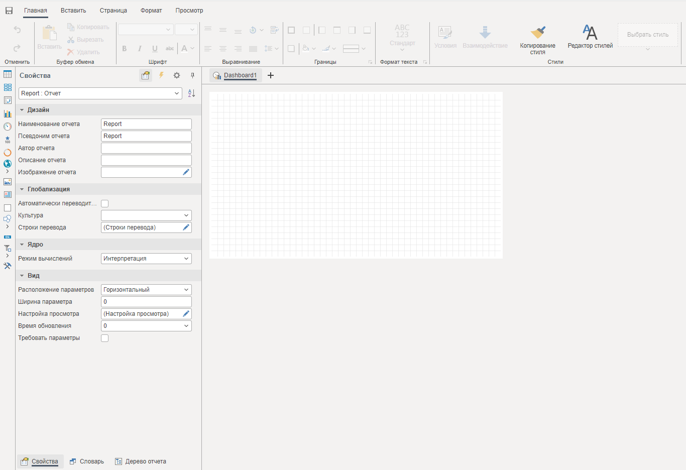 Шаблон отчета представляет собой область в дизайнере отчетов (вне страницы или панели индикаторов), в которой создается структура отчета или панели индикаторов с использованием компонентов или элементов соответственно.