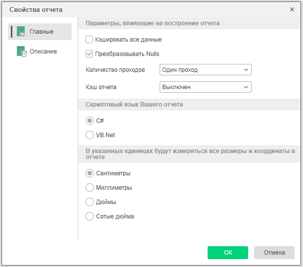 Кэш отчета - предоставляет возможность выбрать режим использования кэширования отчета: Включен, Выключен или Авто. Если текущее свойство установлено в значение Авто, то режим кэширования отчета будет включаться автоматически, в случае если количество страниц отчета больше 200.