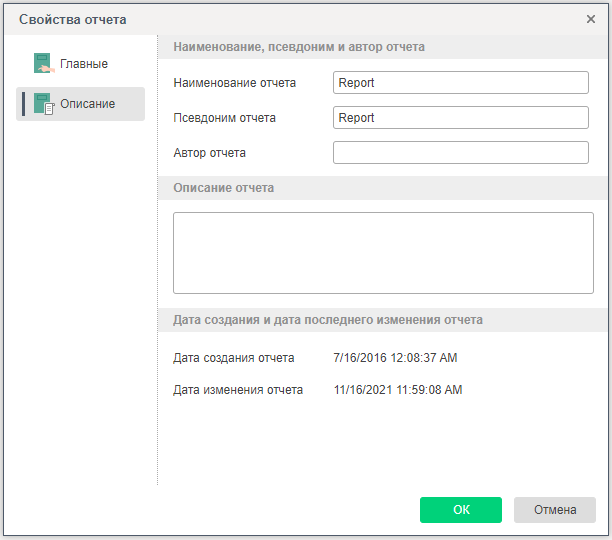 Описание отчета - предоставляет возможность изменить описание отчета.
