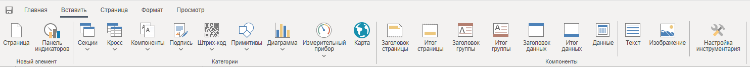 Инструментарий В разделе Инструментарий (вкладка Вставить) представлены инструменты для визуализации данных в отчете. Инструментарий
