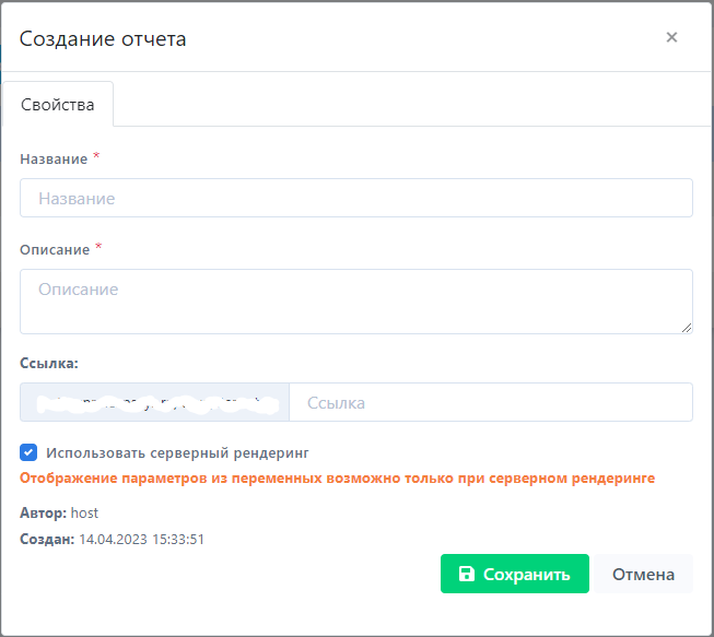 и заполнить пункты в появившимся диалоговом окне: {Название} и {Описание}. Пункты {Автор} и {Создан}, заполняются системой автоматически, так же есть возможность указать адрес ссылки на отчет;.