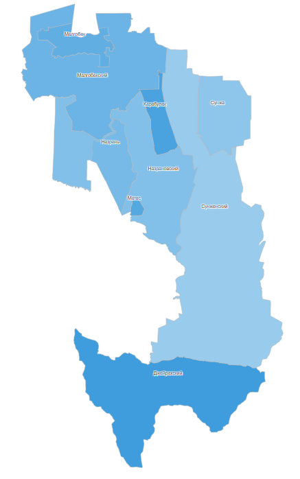 В таблице ниже представлен список районов для данного региона Российской Федерации, их автоматическое наименование, ключ, а так же ИСО+ОКАТО код: