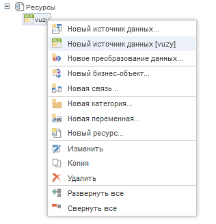 Выделить ресурс в словаре данных и в контекстном меню выбрать команду Новый источник данных [Имя ресурса] (New Data Source [Resource Name]).