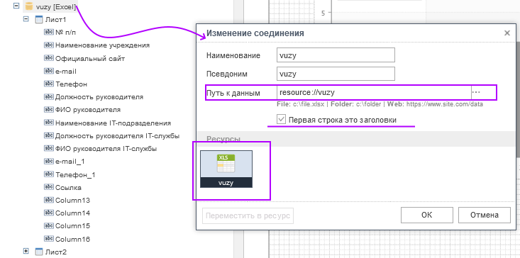 После того, как файл с данными добавлен в отчет как Ресурс и на его основе, можно создать источник данных, для этого необходимо:
