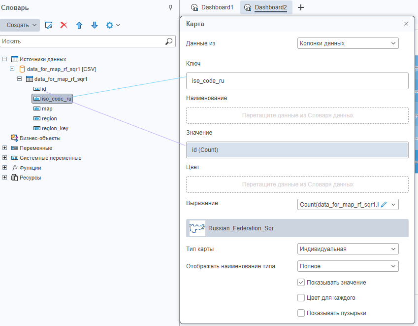 В качестве ключа, для региональной карты Российской федерации необходимо перетянуть из Словаря данные с ИСО-кодами регионов РФ: iso_code_ru