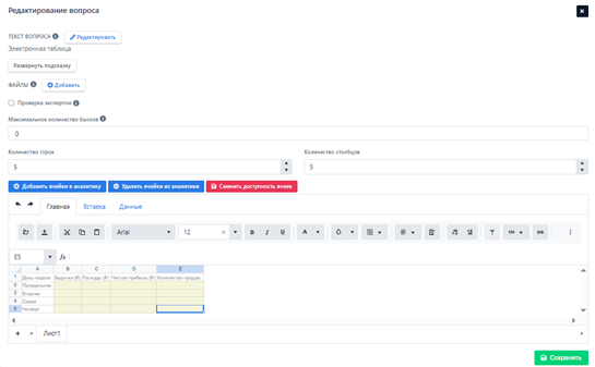 К данному типу вопроса можно прикрепить файл, указать максимальное количество баллов за ответ. Также есть возможность выбрать ячейки, которые будут отображены в аналитике (в конструкторе окрашены в бежевый цвет), сделать ячейки недоступными для редактирования при прохождении, изменить размер таблицы, добавить валидацию для нужных ячеек и выгрузить таблицу формата ".xlsx".