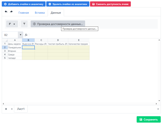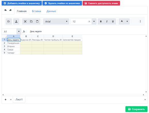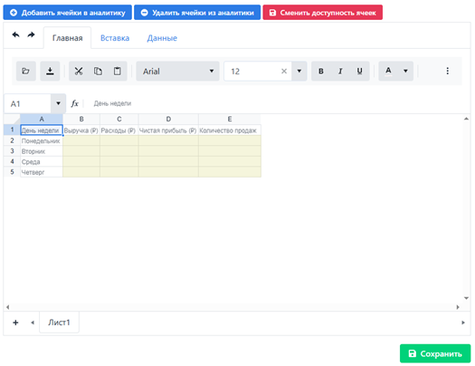 Для сохранения конфигурации электронной таблицы и ячеек для аналитики необходимо нажать кнопку Сохранить.