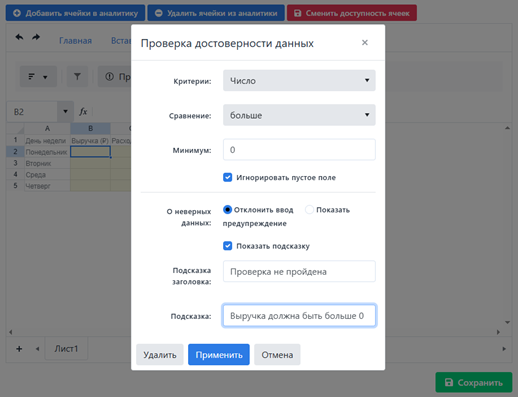 Настройка валидации ячейки В1 “Выручка”