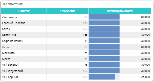 Таблица - элемент анализа данных, в котором возможно отобразить значения полей данных в режиме Показатель и Измерение, а также применять к значениям полей данных Гистограмму, Цветовую шкалу, Индикатор, Спарклайны.