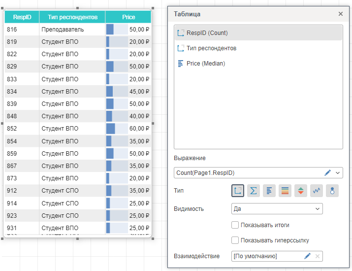 Гистограмма - к значениям поля данных могут применяться различные функции, а также для каждого значения этого поля будет добавлена гистограмма.