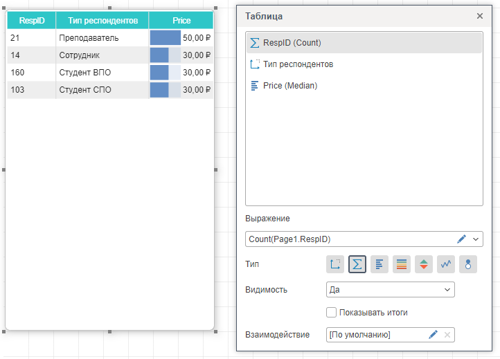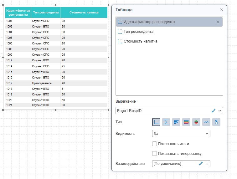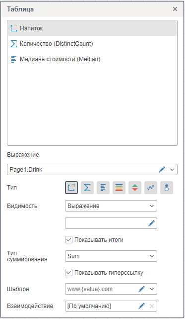 Также, элемент таблица содержит настройки агрегирования данных, такие как: фильтрация, сортировка, замена значений, расчет нарастающего итога и т.д.
