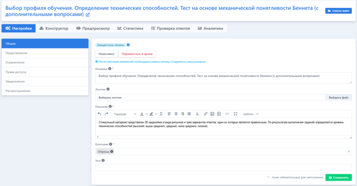 После заполнения всей необходимой информации, настройки всех вопросов и сохранения всех изменений (кнопка Сохранить), анкету необходимо Опубликовать, используя соответствующую кнопку: