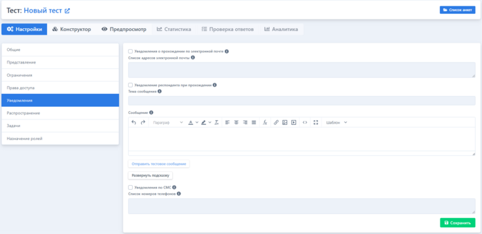 Отображение настроек теста. Вкладка «Уведомления»