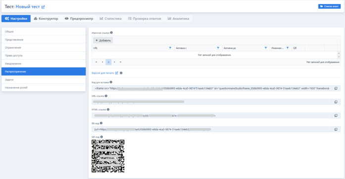 В данной вкладке настраиваются различные ссылки для распространения анкеты.