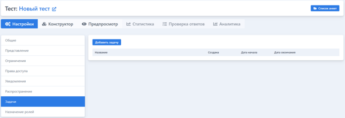 Отображение настроек теста. Вкладка «Задачи»