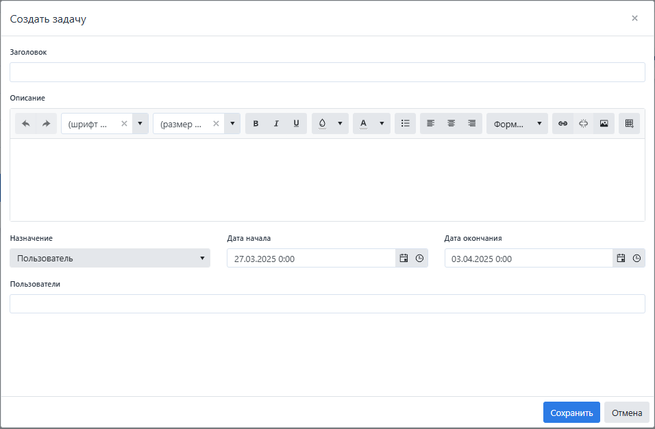 Описание - описание задачи, так же данное поле позволяет редактировать и форматировать вводимый текст, добавлять гиперссылки, изображения и таблицы;
