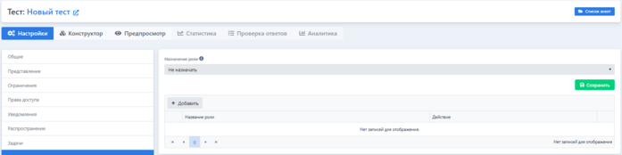 Отображение настроек теста. Вкладка «Назначение ролей»