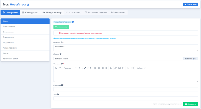 При добавлении нового теста, его текущий статус будет отображен как Черновик, для тестов с данным статусом недоступны вкладки Статистика, Проверка ответов и Аналитика.