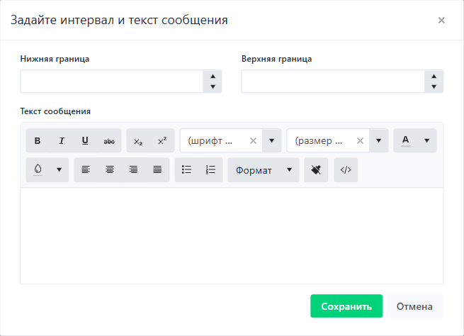 Шкала оценок - доступно если отмечено и включено отображение баллов после тестирования. Настройка шкалы производится с помощью кнопки Добавить интервал и сообщение, где указывается нижняя и верхняя граница, а также текст сообщения: