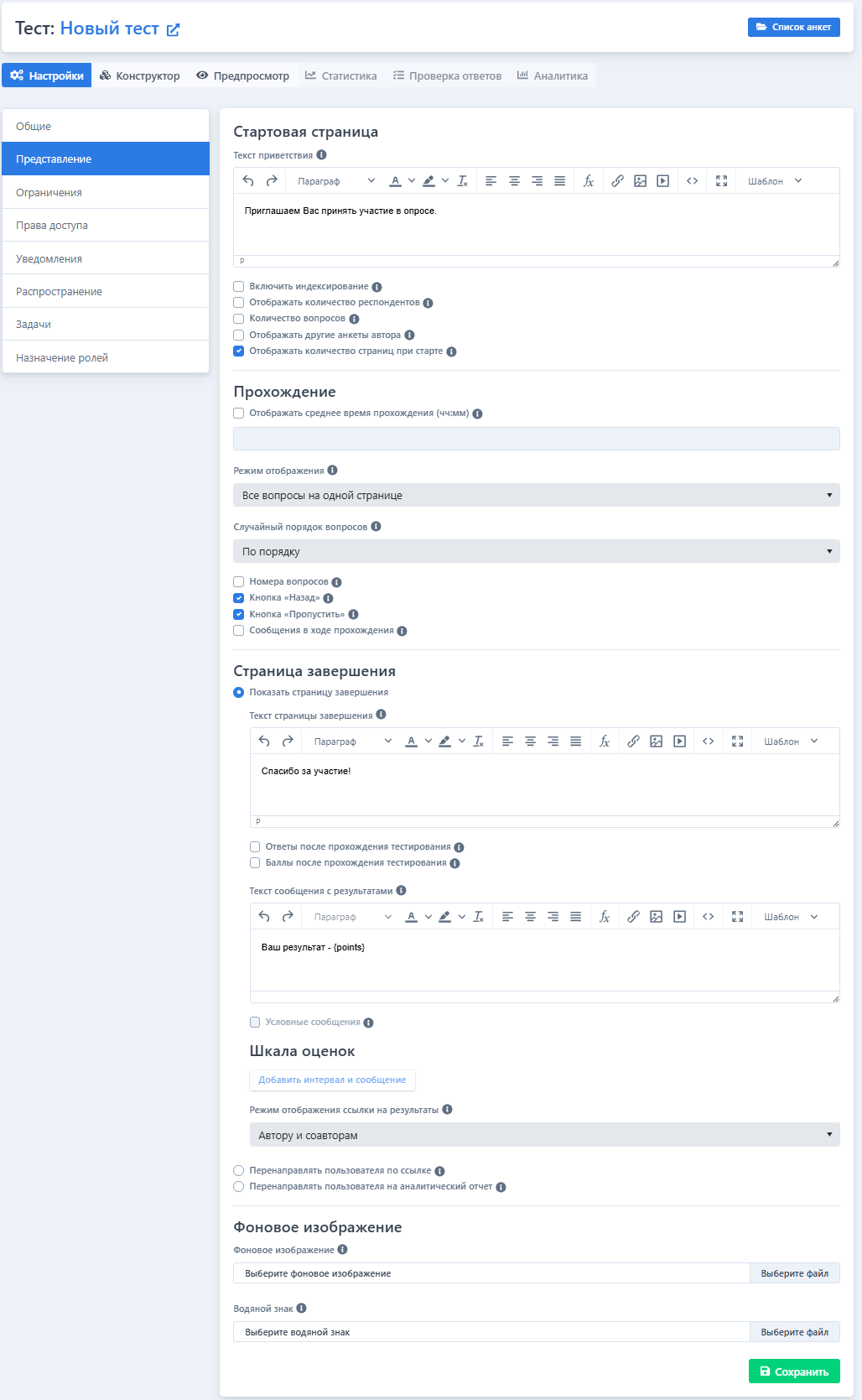 Режим отображения – выберите режим отображения анкеты или теста.Внимание! Фактический режим отображения задается здесь, а не во вкладке Конструктор.Для прохождения анкеты предусмотрено три режима представления вопросов: Страницы, Вопросы, Все вопросы на одной странице.