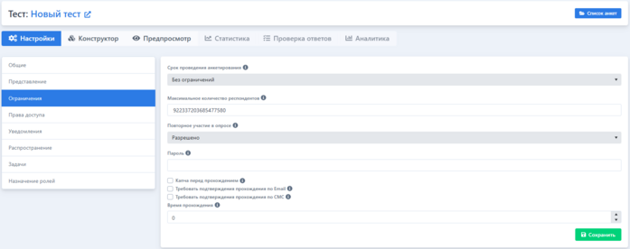 В данной вкладке настаивается совместная работа над анкетой, а также ограничения для прохождения.