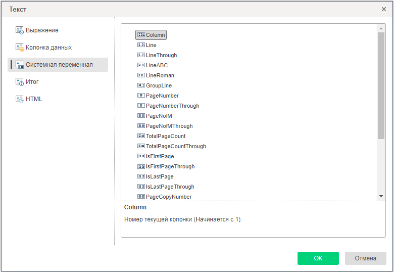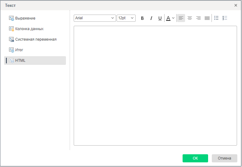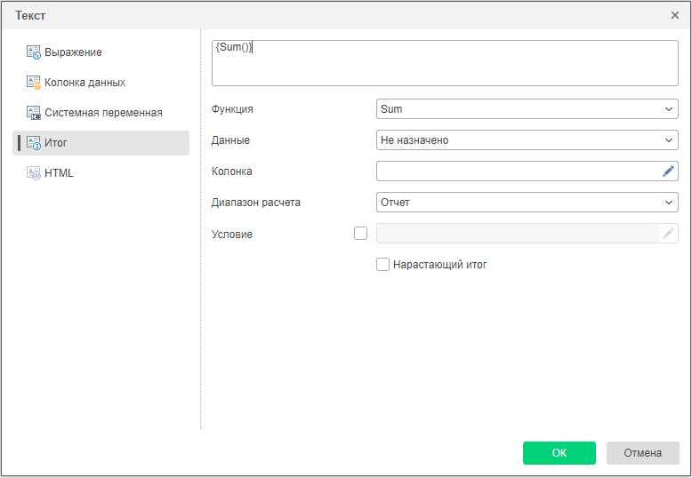Редактор содержит несколько вкладок, в которых можно изменить выражение текстового компонента, выбрать колонку данных, системную переменную, указать расчет итогов, вставить html.