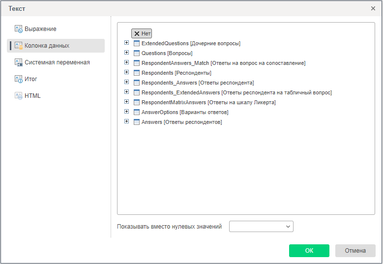 Вкладка представлена одной панелью, на которой отображаются только колонки данных из Источника. При выборе колонки будет сформированно выражение, которое представляет собой ссылку на описание данной колонки в Источнике данных отчета. Также в данной вкладке, присутствует параметр Показывать вместо нулевых значений, при помощи которого можно указать символы, которые будут отображаться вместо нулевых значений выбранной колонки данных. На примере выше, вместо нулевых значений выбран прочерк.