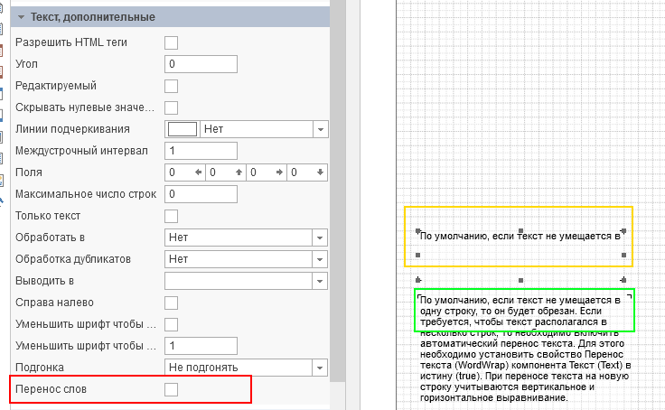По умолчанию, если текст не умещается в одну строку, то он будет обрезан. Если требуется, чтобы текст располагался в несколько строк, то необходимо включить автоматический перенос текста.