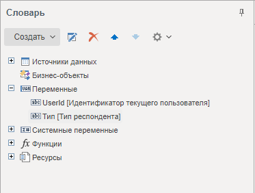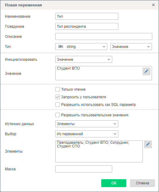 Для более детального изучения результатов опроса, может возникнуть необходимость просмотра результатов по конкретному типу респондентов. В этом случае, необходимо создать переменную со списком типов респондентов, а также предусмотреть возможность выбора значения переменной пользователем. Для этого следует: