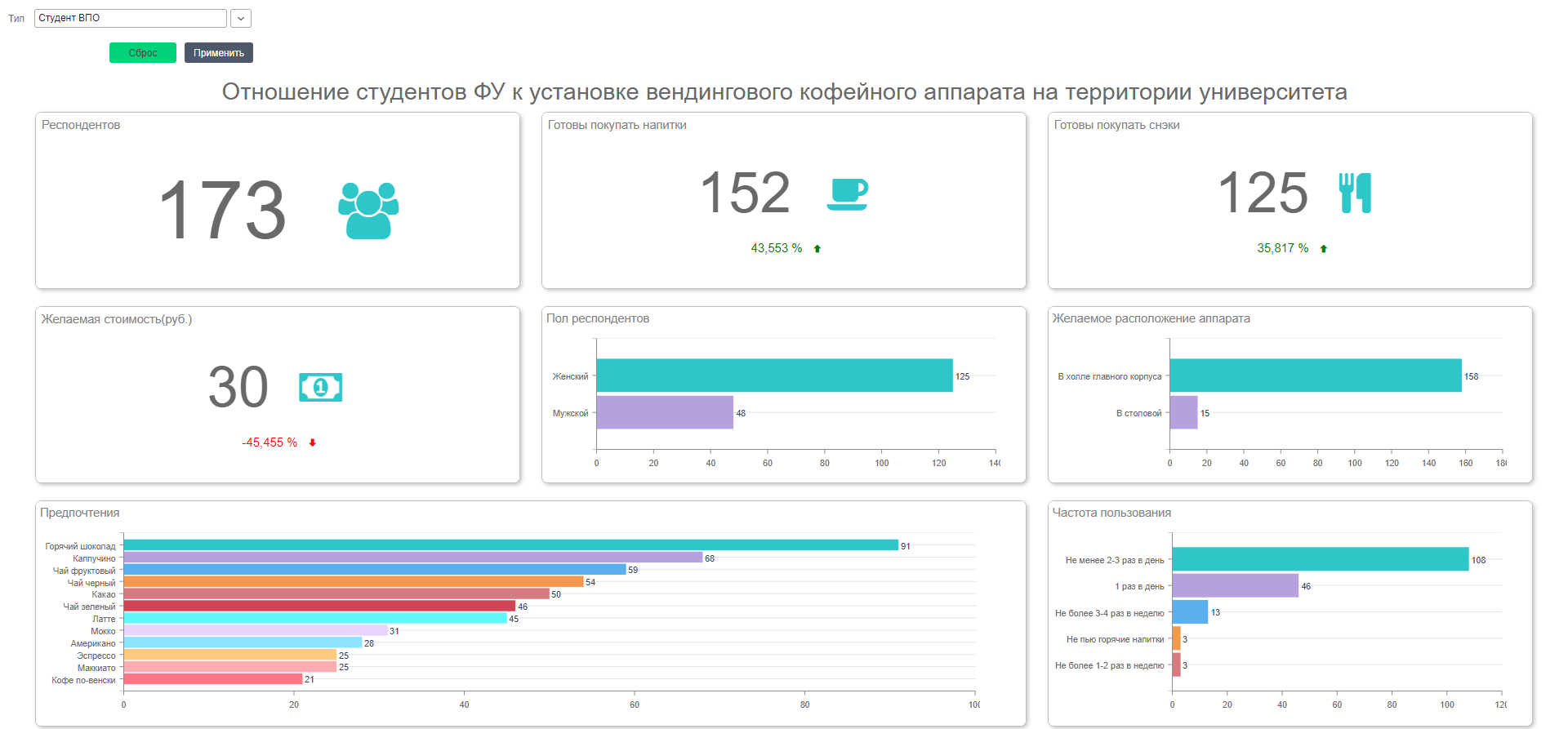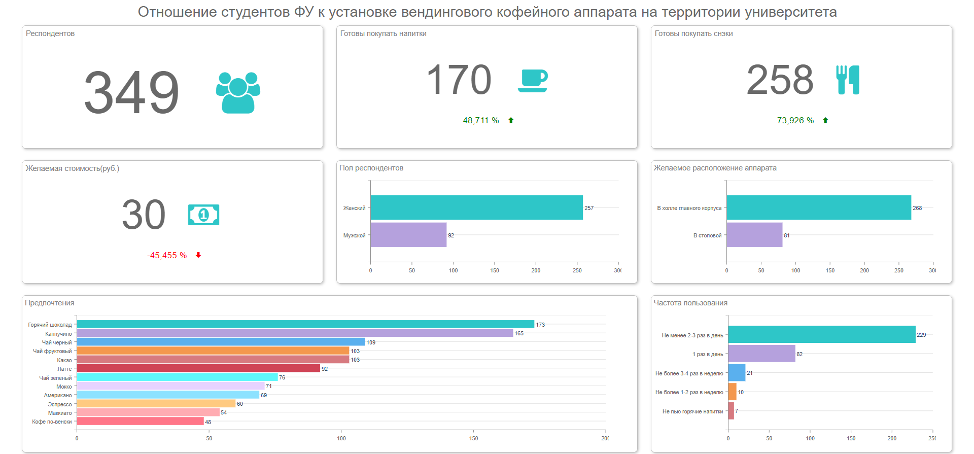 Допустим есть панель индикаторов, которая отображается результаты опроса студентов об их отношении к установке вендингового кофейного аппарата на территории университета.